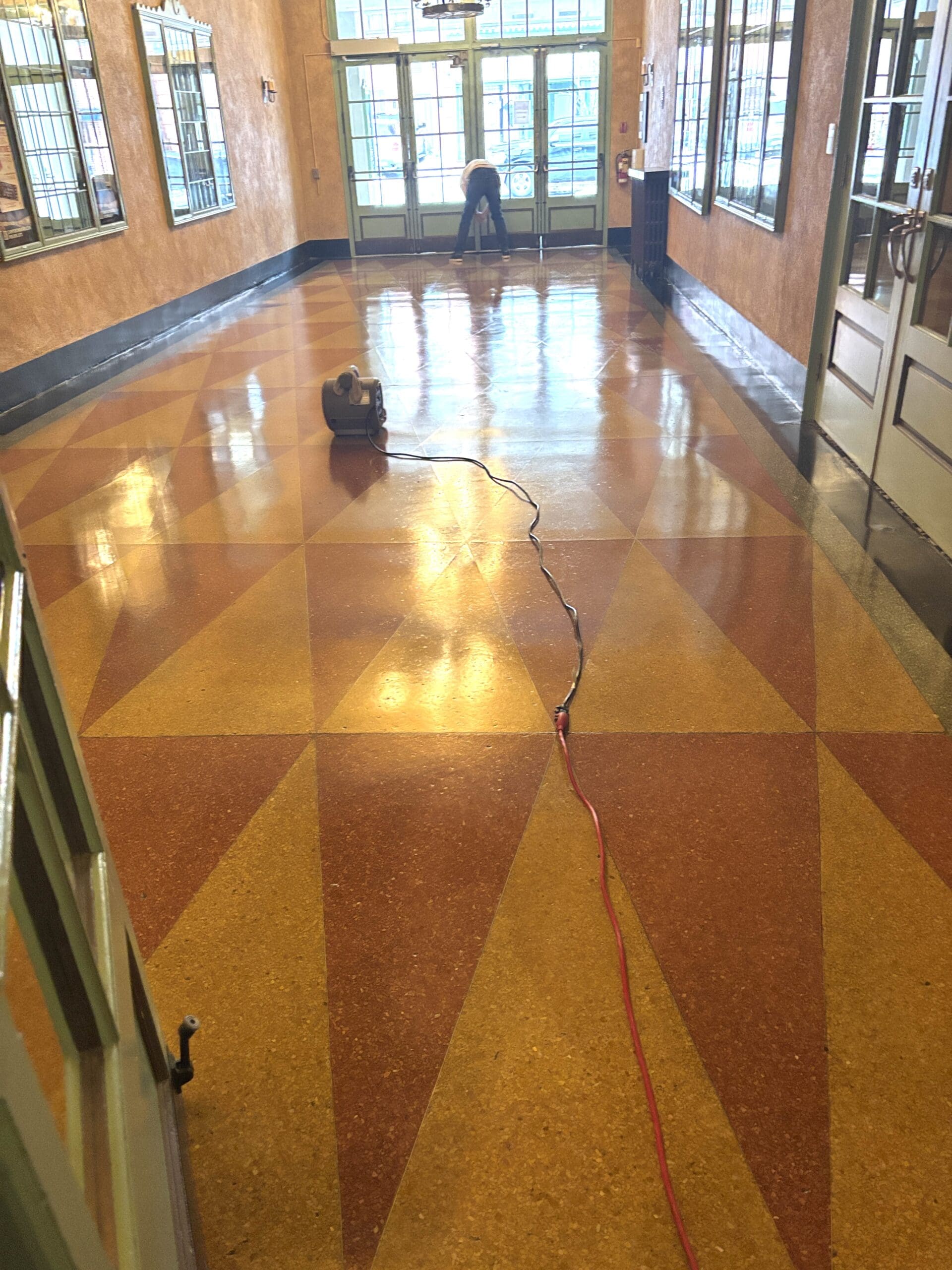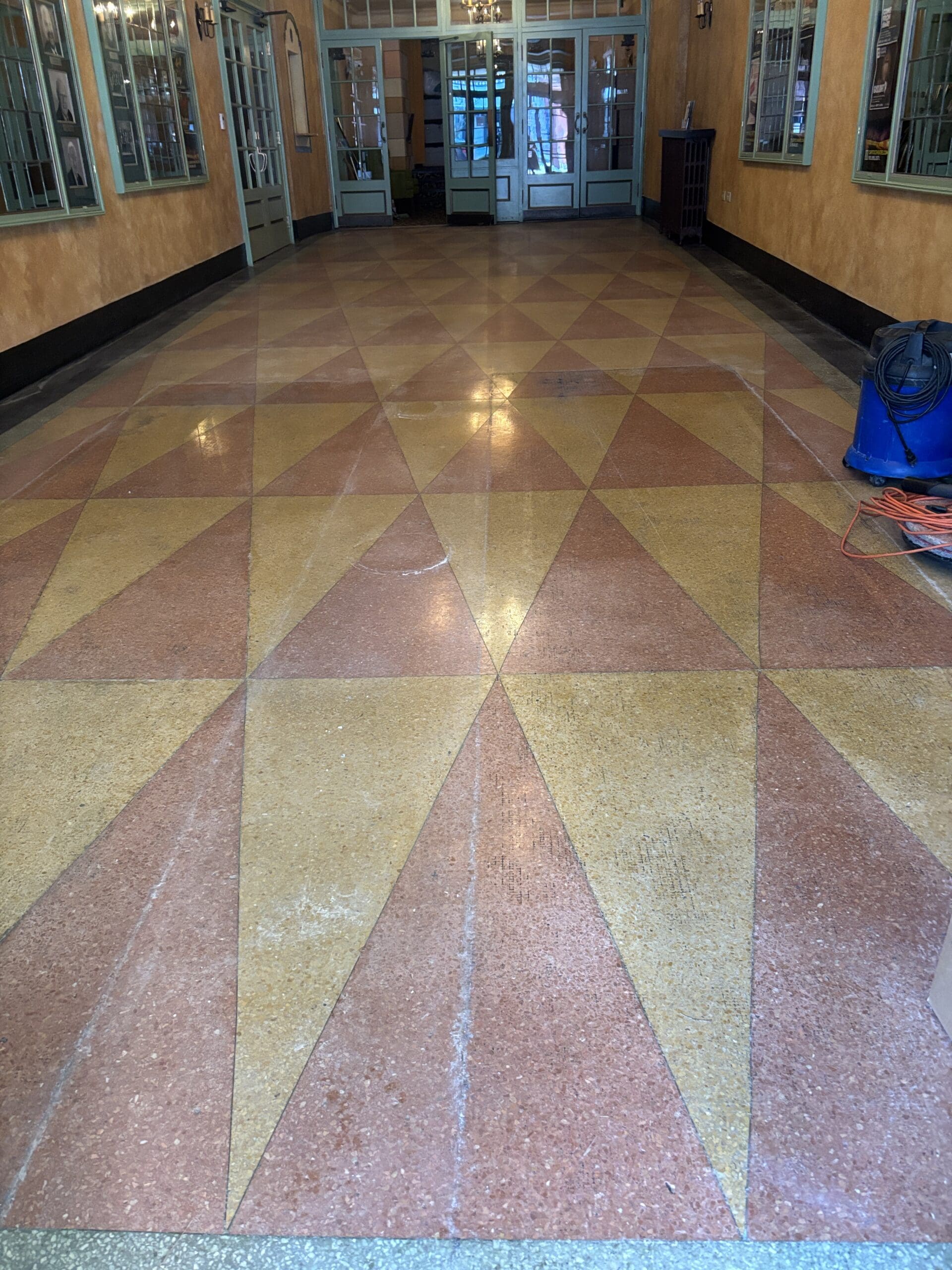Located in the theatre’s original entrance, the antique terrazzo floor had seen decades of foot traffic from patrons, performers, and staff. While the character and craftsmanship of the floor remained unmistakable, time had taken its toll on the surface. Our team carefully refinished the terrazzo to restore its natural beauty while respecting the historic integrity of the space.